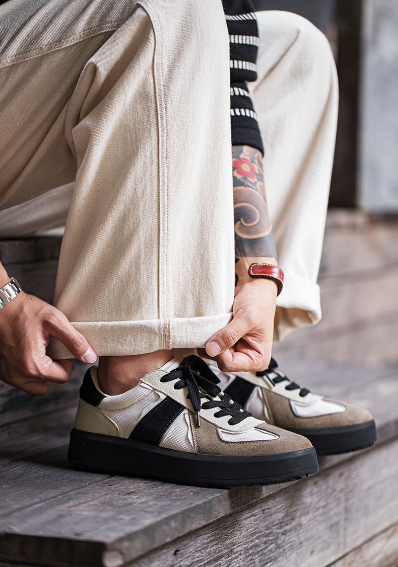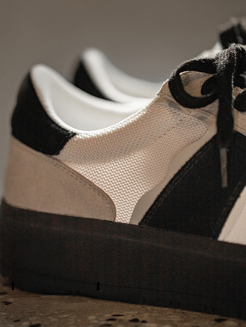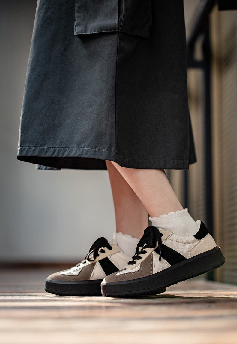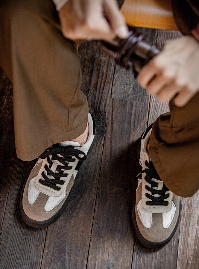 ベージュとブラックのコンビカラーが洗練された印象のスニーカー。スタイリッシュに足元を引き締めます。